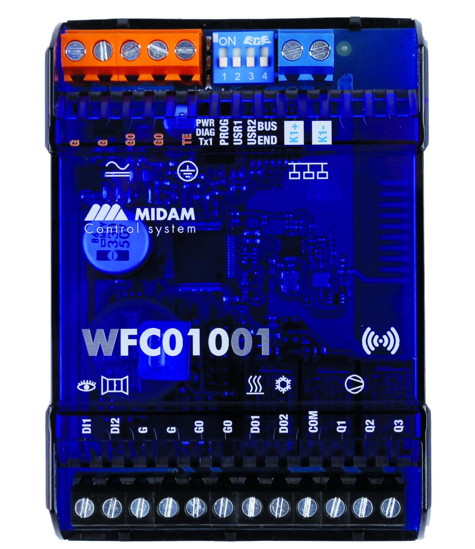 Bezdrátový regulátor fancoilu s možností třístupňové regulace rychlosti ventilátoru a ventilů topení/chlazení. Může pracovat zcela autonomně, nebo být díky integrované modbusové mapě zapojen do nadřazených systémů PLC/SCADA. Komunikace probíhá AES128 šifrovaným protokolem Midam KFP, který rovněž umožňuje bezdrátovou aktualizaci firmware v zařízení. Vhodným pokojovým ovladačem pro tento regulátor je WRU01001.